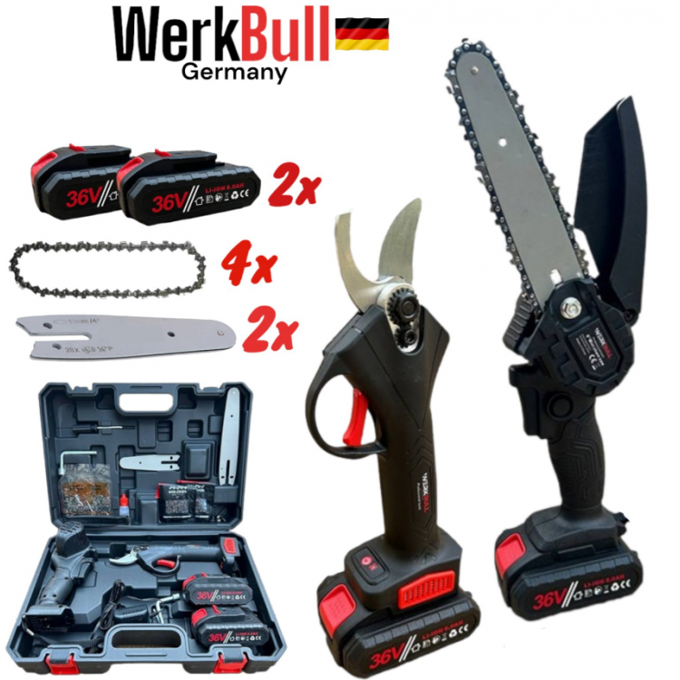 Σετ 2 εργαλειων με μοτερ χωρις καρβουνακια ,Ψαλιδι κλαδεματος και μινι αλυσοπριονο 36V WERKBULL Germany